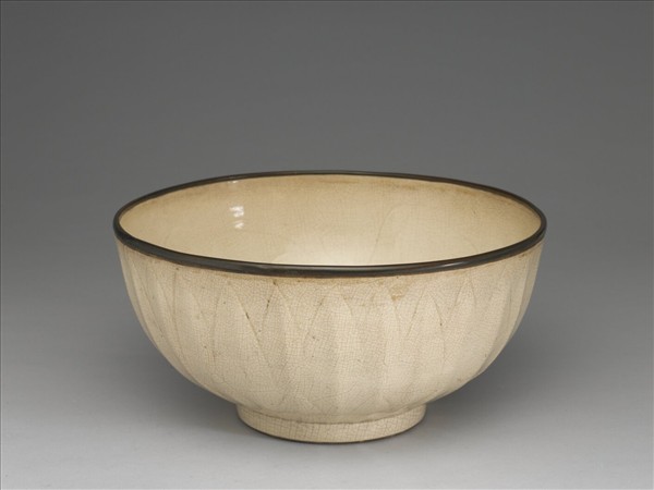 直口深弧壁大碗,口緣鑲銅釦,圈足,足緣露胎。內外壁施透明釉,呈米黃色。外壁雕刻雙層長形蓮瓣為飾,蓮瓣以雙刀削成,中稜高起。內壁劃花裝飾簡單的弧線繪寫草花與柔軟的枝梗。