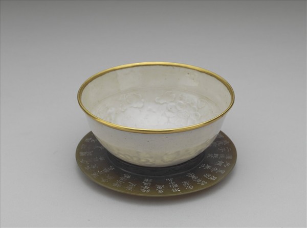敞口小碗,深弧壁下斂,圈足。器內外施透明釉,呈色白,外壁光素無紋,內壁以印花技法飾紋樣:內底心中央有六瓣盛開花一朵,內周壁飾盛開菊花與花葉。器壁甚薄,映光可見。口緣嵌金釦稜。此器附一新石器時代凸緣璧,並刻有乾隆御製詩,是清高宗以玉壁作為此瓷盞之盞托,而盞足恰可容於璧內緣,轉成瓷碗與茶托的組合。詩文為:「托子古玉滄桑閱,茗盂永樂傳胎脫。一脆一堅殊不倫,相資合體誠奇絶。輕於宋定薄於紙,炙手微嫌茶湯熱。置之托子温須臾,適用酌中品芳潔。試想盧仝陸羽輩,安能以此領茶悅。既笑二子或逢斯,掉頭弗顧應罷啜。」成於乾隆五十年(1785),收於《御製五集》卷十三。詩題為「詠玉托子 永樂脫胎茗盂」,則乾隆皇帝視此為永樂脫胎器,亦與永樂器不類。