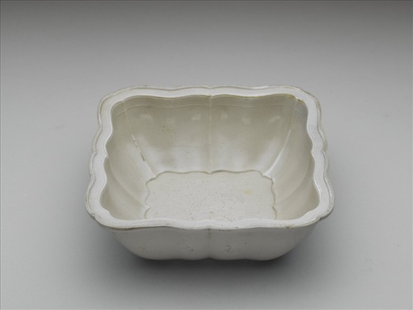 器作方形,轉折處呈圓角。侈口出窄邊,並突起一週細稜,淺壁上豐下斂,平底內陷,緣邊凸起成淺圈足。口沿印卷雲紋一週,內壁上緣印回紋。底心滿印雲紋,中臥四羊。胎骨稍厚而釉薄,底週無釉露灰白胎。底面鐫刻乾隆皇帝〈詠定窯三羊方盂〉:「粉定出北宋,花瓷實鮮看。非紅寧紫奪,惟白得初完。坤二形堪表,乾三義具觀。因思切已戒,敢忘作君難」御製詩。詩末署「乾隆乙未御題」紀年銘(乾隆四十年:1775),並落「比德」和「朗潤」兩枚鈐印。乾隆皇帝在〈詠定窯三羊方盂〉的詩注中,以「蘇東坡詩,定州花瓷琢紅玉,今之定瓷皆白色無采。所謂粉定也,然率素質。若此隱起三羊紋者,即東坡所謂花瓷,亦無不可」,表達出他因將此品看成是定窯,故提出隱起器內的三羊圖(其實是四羊),未嘗不能看成是蘇軾詩中的花瓷。雖然今天已無從得知乾隆皇帝如何得出此一推論,但他的看法確實和當今學者通過詩與實物比對研究後所得出的論點大致相符。另外,對照乾隆四十年(1775)《活計檔》紀錄,乾隆皇帝曾降旨將一件收藏於「樂壽堂金昭玉粹定磁洗交懋勤殿」刻詩,因這件作品的御題紀年正好是乾隆四十一年(1776),且透過御製詩,得知乾隆皇帝將之視為是定窯,故研判檔案所記或正指這件作品。