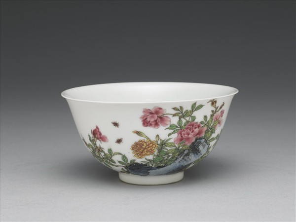 這件碗侈口、深弧壁、矮圈足。器內平素無紋,外壁一面彩繪月季、萬壽菊,以及湖石、蜜蜂,另一面以墨書寫有「朝朝籠麗月,歲歲占長春」二句,詩句前有「佳麗」,後有「金成」、「旭映」共三枚紅料印。器底帶「雍正年製」二行藍料宋體字雙方框款。