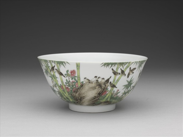 侈口深壁,平底,矮圈足。胎薄可透光,器內無紋,外壁以琺瑯彩料繪竹林、奇石,盛開的紅色芙蓉花,以及二十四隻喜鵲,鵲鳥嬉戲竹林間,紋飾描繪細緻,寓意時時報喜、竹報平安、花開富貴、吉祥如意。留白處加題詩句、閒章。底以藍料書寫宋體字雙方框款「雍正年製」,外加雙方圈。
