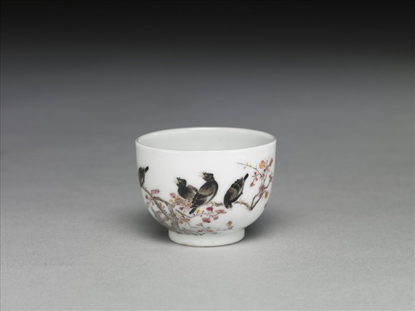 斂口,深壁,矮圈足。薄胎白泑,外壁彩畫楓樹一株,赭墨鸜鵒四隻,題:「鵲鳴傳喜氣」。紅料描繪「佳麗」印一,底有藍料書「雍正年製」四宋體字款。