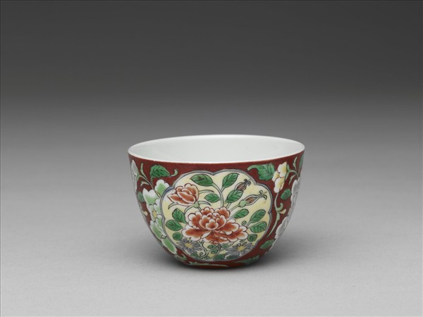 這件杯子敞口、深腹、平底、淺挖足。器內平素無紋,外壁以紅釉為地,間飾三個八花口開光,開光內以淡黃釉為地,分別繪以折枝牡丹、二色菊花和月季雛菊,開光之間並間飾黃、綠、紫各色花朵。器底帶「雍正御製」二行青花楷書雙方框款。