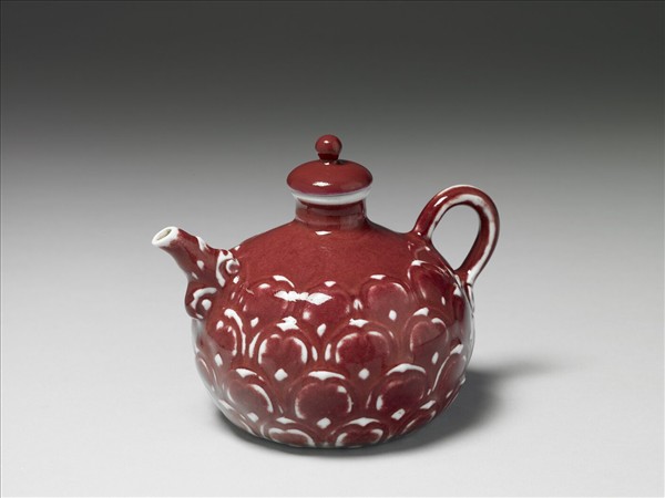 卷口,短直頸,斜肩,圓腹,平底,淺挖足,曲把,短流,帶蓋。壺身淺刻蓮瓣四層,流口一層。外壁及器蓋全施紅釉,內壁及足底則施白釉。胎骨勻厚,釉色鮮紅,白釉泛青,器口、足、流口及凸棱處均露出白筋。圈足露胎,潔白細緻,胎釉一線呈淺橙色,並帶鐵質斑點。器底青花雙圈內書「大明宣德年製」二行六字楷款。