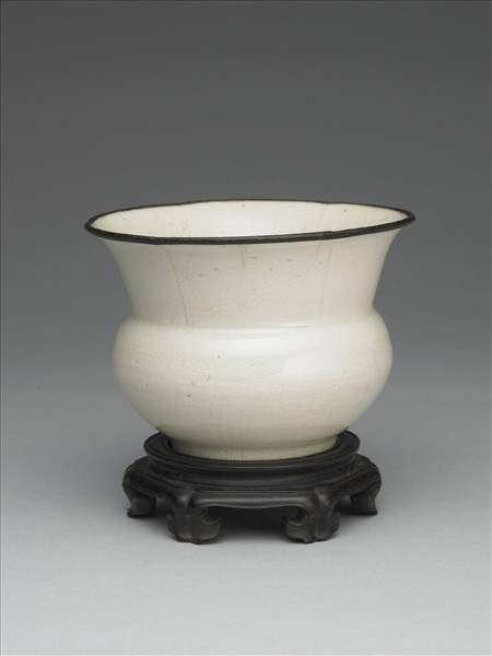渣斗即俗稱的痰盂,侈口,口微撇,口作六瓣葵花形,斜直寬頸,扁圓腹,矮圈足;口與腹略等高,口沿鑲銅扣。全器光素無紋,內外壁滿施釉,釉色牙白,釉面滿佈冰裂狀細紋;足露一圈胎,呈色淺黃帶灰。帶一木座。本件有倫敦展標籤編號「207」,顯示此件曾於西元1935至1936年間由故宮出借至英國倫敦參加「倫敦中國藝術國際展覽會」(The International Exhibition of Chinese Art, London, 1935-6) ,當時名稱定為「金宿州窯瑩白葵花式渣斗」。