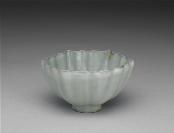 菱形花口碗,六個邊角微外侈,弧形深壁,周壁順應菱花口,呈現凹凸稜面的變化。胎質堅薄,矮圈足。採墊燒法燒製,內外施青釉,釉色淺淡泛灰,釉質乳濁,口沿釉薄處現出淺灰邊。外底心鼓起一點,圈足著地處無釉,露出淺灰色胎,足壁有多層施釉痕。對照江蘇省溧陽平橋、金壇堯塘西榭村和四川省彭州等處窖藏出土的金銀器,而可追溯出臨仿的原型。相形之下,浙江省龍泉市溪口小梅窯和杭州市老虎洞窯址紛紛出土相似的器形,則流露出不同窯口,共同追仿金銀器的時代風尚。