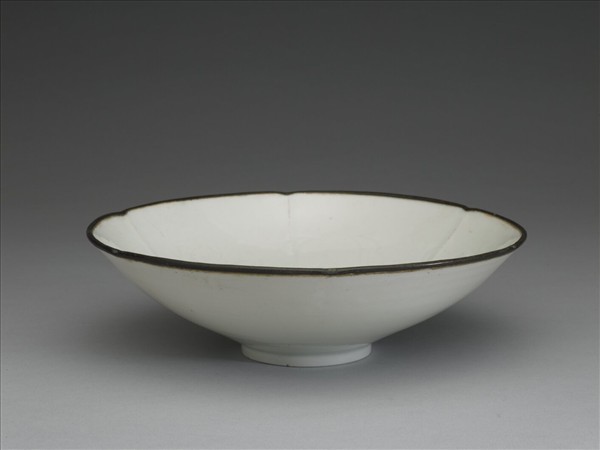 全器作六瓣葵花形,寬侈口,斜壁,腹壁亦微勒六道凹痕作花瓣分稜,平底,矮圈足,口沿鑲銅釦,整體造形典雅大方。器外壁光素無紋,內壁自器腹至碗底淺劃牡丹花、花苞及葉紋。全器通體施釉,釉色白中泛青。本件有倫敦展標籤編號「211」,顯示此件曾於西元1935至1936年間由故宮出借至英國倫敦參加「倫敦中國藝術國際展覽會」(The International Exhibition of Chinese Art, London, 1935-6) ,當時名稱定為「南宋湘湖窯淺粉青劃花芙蓉葵花式碗」。
