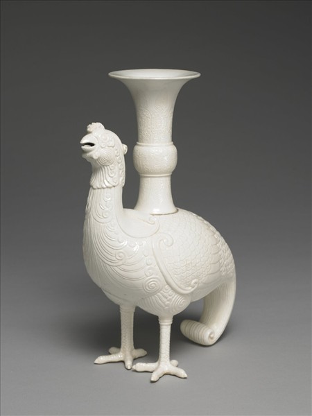 全形如一隻鳳鳥,雞形而長尾,昂首直立,長尾著地,背上背著一個觚式瓶;器裡中空,可以盛放液體,並由鳳鳥微張的口部流出。足底露胎,色白堅緻,應為景德鎮黏膩的瓷土所成,故能細雕全形,以雙足挺立。鳳鳥的羽翅清晰分明,嘴喙浮雕的口舌生動,是一件精細的瓷雕作品。器罩透明釉,呈現瑩白光亮的色澤。這種駝瓶直立的靈鳥造形,早在戰國時期便已經出現,在十七、十八世紀時又再度盛行,但多雕刻細膩,取形於自然界的禽鳥;相似造形的天雞尊也見於同時期宜興窯的作品。