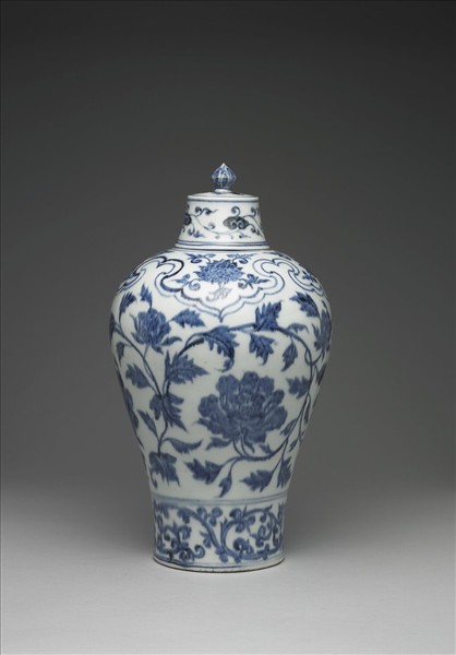 小口圓唇,短頸,聳圓肩,腹修長,上豐下斂,近底處略外撇,底內微凹為圈足。通體施白釉,紋飾以青花繪成,以雙圈線分作三組,肩部為如意雲頭紋,內繪折枝蕃蓮花,腹飾纏牡丹花葉紋,近圈足處繪草葉紋。梯形蓋,繪纏枝花葉紋,上有蓮苞形鈕。