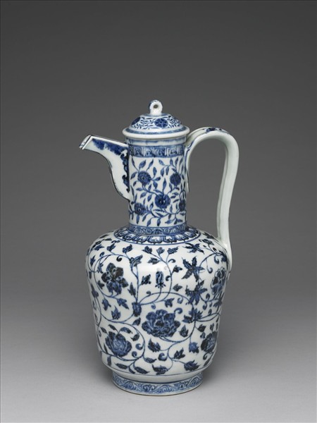 明代初年,朝廷與中亞、西亞時有往來,瓷器的形制、紋飾也反映了交流的點滴,許多帶有伊斯蘭文化影響的器形以及裝飾紋樣應運而生,長頸執壺的器形模仿的即是中亞的黃銅器及陶器。口部有一圈圓稜,長直頸,平肩,長筒形腹,向下略內收,矮圈足。頸部前有長流,流口內緣做葫蘆形,後有扁鋬形把手。肩部較圓潤,器腹無開光,滿飾纏枝茶花、月季、芙蓉、牡丹、蓮花、菊花、秋葵、梔子、石榴等紋飾,圈足內上釉,無款識。器蓋上的青花布局及筆力與器身紋飾有明顯差異,應為清代所配。傳世及景德鎮出土可以見到器形及紋飾布局相類,但器底帶有「大明宣德年製」六字雙行雙圈楷書款的作品,所以將本件作品訂為明代永樂到宣德期間。另外,景德鎮珠山遺址還出土有白釉方流長頸執壺,器形相類,但流口內緣為長方形,一般認為製作時間較青花同型器稍早。