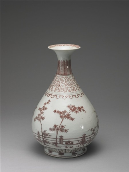 圓形撇口,直頸,頸上下微撇,腹部上斂下豐碩而下垂,圈足微外撇。器形似一般所謂「玉壺春瓶」。全器通體施白釉,以釉裡紅繪畫紋飾,口沿內鉤畫卷草紋一周,頸上飾蕉葉紋一周,下接轉枝花葉紋一周;兩者間以線紋一周。腹部上方頸肩處裝飾如意雲頭紋一圈,頸肩與器腹紋飾間有三道弦紋。腹部繪竹、石、芭蕉三友紋,間飾柵欄、花草、岩石等庭園造景,筆觸流暢,宛如一幅園林小景繪畫。脛飾變形蓮瓣紋,足圈則畫朵花一周及一圈線紋。釉裡紅呈色較暗,呈暗灰色。足地上釉,足端無釉,呈黃褐色。足內中央有青花書「大明宣德年製」二行六字楷款,外加雙圈。