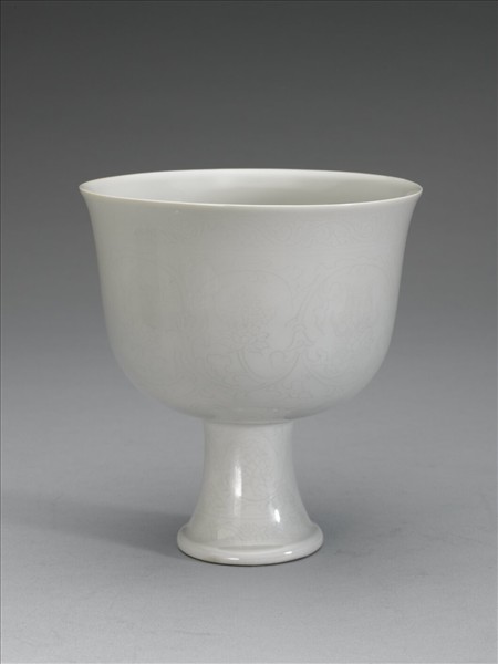 高足杯的口部外侈、圓弧壁、高圈足,圈足外撇。胎體稍厚。全器施白釉,釉略偏灰,圈足著地處露胎。器物外壁以細線刻畫紋飾,主紋飾為蓮托八寶紋,其下有六個雲頭紋,圈足外壁並有四朵纏枝番蓮紋以及小花一周。器內壁平素無紋,僅在杯心刻畫「永樂年製」雙行四字篆書款,外加單圈。元代即已得見與此器形相類,呈倒鐘形的金器與瓷器高足杯,院內另藏有一件器形相同但尺寸稍小的明代洪武時期青花穿蓮夔龍紋高足杯,可以看出其由元代以及明代洪武時期以來的淵源。