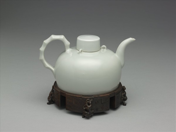 單把壺的壺身呈半球形,小口、短直頸、圓肩、器腹略內斂、平底、淺凹足。器肩上有三個環形繫鈕,器身一側帶曲流,另一側帶竹節把手,並有一平頂直璧原形蓋罩住口頸。全器除足底露胎外,均施以白釉。全器光素無紋,釉色潔白瑩潤。相同器形之瓷壺存世不多,本院另藏有一件器形相同,器身飾以鳳凰一對的青花三繫竹節把壺,有學者推測兩者皆為明初宮庭用茶器。廣東台山南宋沈船中,曾出水有類似造型的錫壺,也有學者據以推測其為穆斯林使用的湯瓶。
