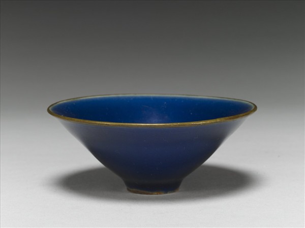 撇口,小圈足,形似宋代斗笠茶盞,口鑲銅扣一圈。通體除底外均施回青釉,釉色濃豔。底無款識,但釉色、形制均為典型嘉靖樣式。回青釉為雲南引進的一種色釉,與霽青釉相同皆以氧化鈷為著色劑,嘉靖回青與青花相同,釉色勻濃帶紫,與其他時代的泛藍色調明顯不同。採用回青釉料的霽青茶鍾,為晚明文人繼白釉茶盞之後的常用器之一。晚明許次紓《茶疏》〈甌注〉項下說茶甌以「純白為佳」,「次用真正回青,必揀圓整。」顯見這類回青釉茶鍾頗受晚明文人喜愛。《點查報告》上名稱為「霽青銅鑲口鐃式茶鍾二件」(故瓷017837、故瓷017838),即如前述耀州窯撇口斗笠型茶盞(故瓷013974、故瓷008726),清宮將這類形制通稱為「鐃式茶鍾」。