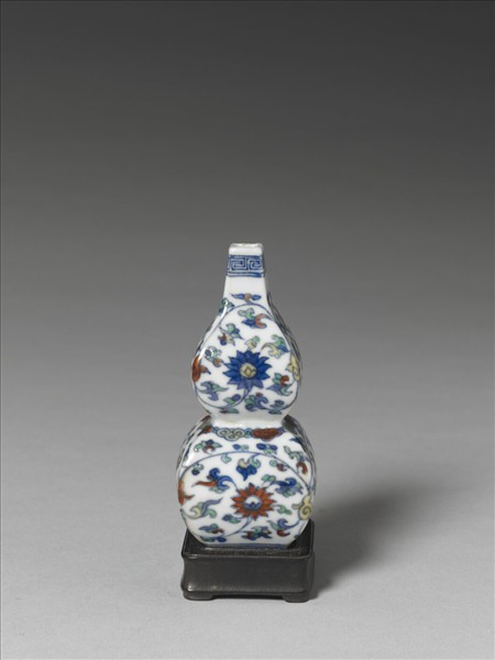 葫蘆形四方小瓷瓶,小方口,方足,方足內釉下鈷藍書「大明嘉靖年製」六字雙行楷款。全器以釉下鈷藍和釉上紅、黃、淺綠三色彩釉繪飾紋樣。口緣飾回紋一圈,葫蘆狀器體的上下兩部份,皆以鬥彩技法繪飾卷枝番蓮花葉,並讓器體四面都恰好只有一朵側面盛開的番蓮居中,枝葉則卷繞填飾番蓮周邊的隙地。所謂的鬥彩技法,是指先以釉下鈷藍釉青花描出物象的邊廓,燒成後再於輪廓內填飾釉上彩釉。不過,本器的施作還進一步將釉下鈷藍也當作填飾邊框的色彩之一,使得釉上彩與釉下彩,除了描邊與填飾相對而相襯外,也有著同為填飾彩釉的協合相映,釉上釉下,相映相襯成趣。