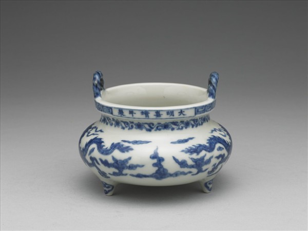 口有方稜,束頸,扁碩腹。底微隆,三短足。口沿有雙立耳,立耳作成繩索狀。全器以青花繪各種紋飾;口邊繪雷紋,頸部繪轉枝花卉,腹壁繪雙龍抱珠、朵雲紋。口邊由右往左橫寫「大明嘉靖年製」六字楷款。