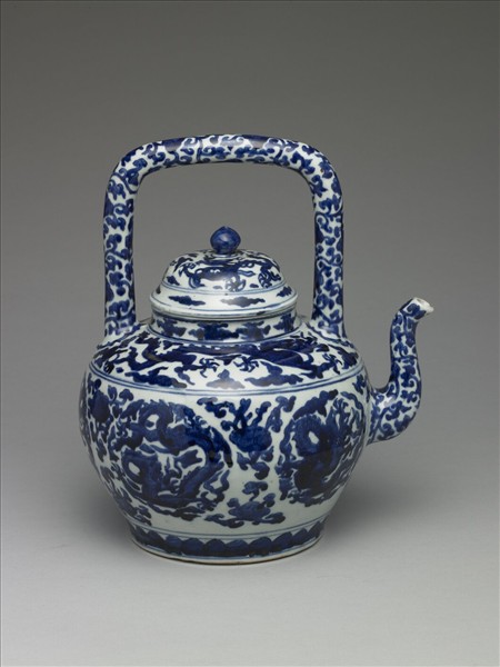 斂圓口,短頸,圓碩腹,平底,淺凹足,拱圓蓋帶蓮苞紐,曲流,ㄇ形提梁,正中提梁內側一氣孔。壺流及提梁滿畫纏枝靈芝紋,壺紐滿塗青色,蓋面飾雙雲龍、朵雲及火珠紋,蓋沿則繪朵雲一周及青線三道。壺頸飾朵雲一周,肩為雙雲龍,腹則飾四團雲龍紋,姿態各異,團龍間飾靈芝托八寶紋,底邊蓮瓣紋一周。胎骨厚重,胎質略粗,腹部接痕一道,足底露胎,胎釉一線呈橘色。青花釉色濃豔帶紫,白釉微泛青色。底青花書「大明隆慶年造」六字二行楷款,外加雙圈。明代晚期大型茶壺較為流行,院藏明代茶壺數量不多,隆慶茶壺則僅見此形,而此壺蓋內沿積茶垢一層,應是經久泡茶之故。