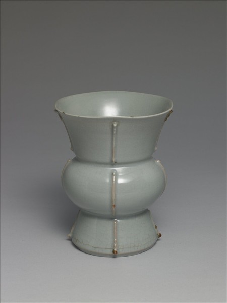 汝窯為北宋北方青瓷之首,至晚明,猶備受賞鑑家的矚目與關愛,品評論述窯品之際,雖首列柴窯,但由於柴窯被視為五代後周世宗之窯,故汝窯仍高居宋瓷之冠。此件為清代仿汝釉的作品,造型以青銅尊為本,再加以變化成長頸、扁圓腹、短脛、平底、矮圈足的形制,器身自上而下貼飾棱脊三層,每層四道。通體施淺青色釉,釉質透明清亮。此件仿汝釉作品,工匠於模仿過程,刻意於邊稜釉薄處做出粉色的胎骨,來傳達汝釉呈粉色光澤的特點。此外,從足緣露胎的情形看來,此件作品實非裹釉支燒,然底部仍出現五枚圓形的支點,中心刻「奉華」兩字,刻痕填紅,更由於深痕過深,細微處露出白色的胎骨。「奉華」二字的含意,一般以為是南宋高宗時寵妃劉妃居住的「奉華堂」。此件作品,「奉華」銘的出現應意在仿古。故知,文物創作的過程中,因受崇古、懷古之情的影響,瓷器的釉色與形制時有摹古的表現,而器底的款識在相同理念的感染下,也會重複出現。