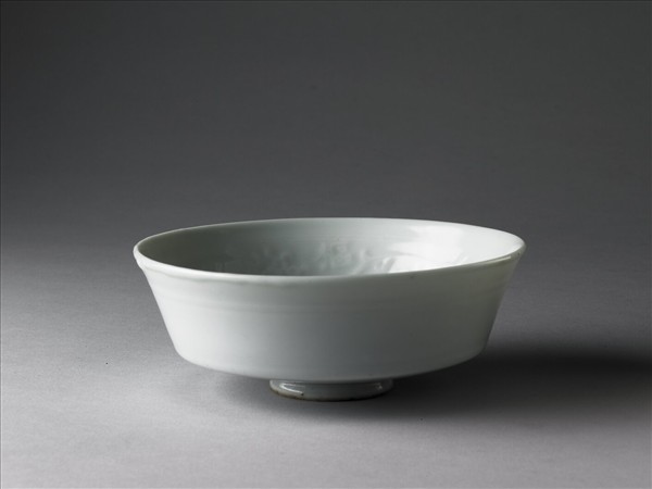 圓侈口,斜壁折腰,小圈足,足壁微向外斜,外足底心有輪製痕及尖臍狀突起,足底切削平整,外足底緣及足裡均無釉。施罩卵白色釉,釉汁平勻、凝脂如玉,胎膩而細。器外壁僅淺淺飾有三道弦紋;器內則印花繁複齊整,內底心為纏枝蓮花四朵,周內壁為轉枝花卉紋,花間一側印有陽文楷書「樞」字,對側為「府」字。 卵白釉是元代景德鎮新燒完成的一種白釉,色調微微偏青,釉面具失透性而不甚流動,釉厚而無開片紋。明初洪武年間,曹昭所著《格古要論》一書曾提到元代有燒小足、印花,內有「樞府」字的景德鎮瓷器;而目前傳世及出土器有「樞府」字樣者,皆為卵白釉,因此一般稱卵白釉器皿為「樞府窯」,器形以折腰碗最為常見。