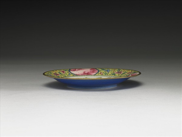 侈口,弧腹,外壁折腹一圈,矮圈足。外壁施琺瑯藍釉,盤心琺瑯彩繪藍冠綬帶鳥、白鸚鵡一對停佇海棠樹枝上,一旁並繪月季花。盤沿三開光內繪胭脂紅山水人物圖,餘隙畫黃地洋花圖案,口沿描金一道。胎薄體輕,錦花及月季花綠葉上均有開片紋及氣泡劃破痕。底藍料書「乾隆年製」四字楷款,外加雙方框。