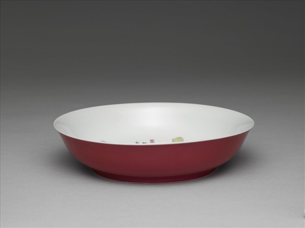 圓形瓷盤,侈口微撇,弧壁,矮圈足。全器通體施釉,盤內壁施白釉為地,盤面以琺瑯彩繪飾山水樓閣圖畫,有墨書題「樹接南山近,煙含北渚遙」詩句,並以紅料在詩句前描繪「壽古」一印,詩句後描繪「山高」、「水長」鈐印。整體圖案大方素雅。外壁滿施琺瑯紅釉,光素無紋,足內地及足內牆施白釉,器外底中央以藍料書有「乾隆年製」四字雙行雙框宋體楷書款。乾隆時期的琺瑯彩瓷視器面為畫表,盡力模擬文人畫作的模式,在器面佈置詩、書、畫與印章。本件圖案與故瓷17877相似,然樓閣岩石略異,圖案布局大致左右相反對稱,兩者應為一對,曾一同於西元1935至1936年間由故宮出借至英國倫敦參加「倫敦中國藝術國際展覽會」(The International Exhibition of Chinese Art, London, 1935-6)。