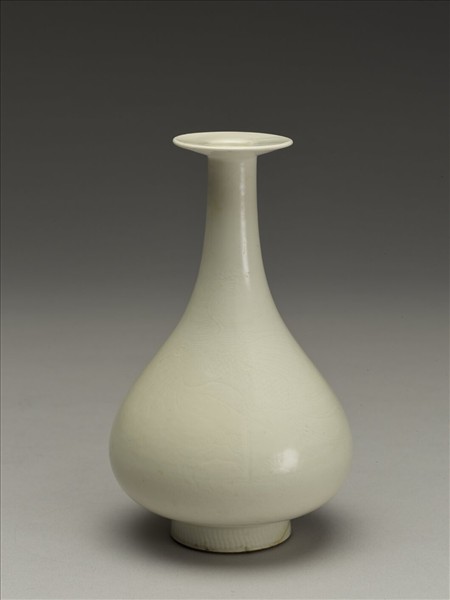 盤形口,長頸,碩腹,矮圈足。腹部淺劃水波竹石,鳳立石上,仰首望日。足上劃曲線紋一周。胎質堅薄,釉色潔白瑩潤。口上略有冷紋數道,足底露白胎。