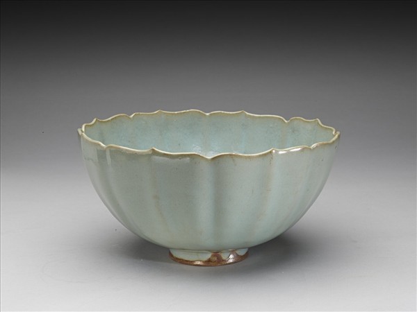 全器作八瓣蓮花形,深弧壁,平底,矮圈足。外弧壁因蓮花之形,呈現有如波浪般起伏的變化。通體罩施粉青色釉,釉質厚潤勻淨。施釉至足際,口沿一道米黃邊。圈足外壁局部沾釉,足壁厚薄不均,足底緣亦不平整。倘若拿「鈞窯粉青蓮花式碗」與院藏南宋「官窯粉青蓮花式盤」做比較,會發現同樣形如花瓣的口沿,其最突出的點所對應到的弧壁,在官窯的作品中是凹進去的,但在鈞窯作品中反而是凸出來的,這個特徵倒與山西馮道真墓出土的「月白釉紫斑輪花盤」雷同,不過細究口沿的輪廓線,院藏「鈞窯粉青連花式碗」遠比馮墓出土者來得細緻、清晰。