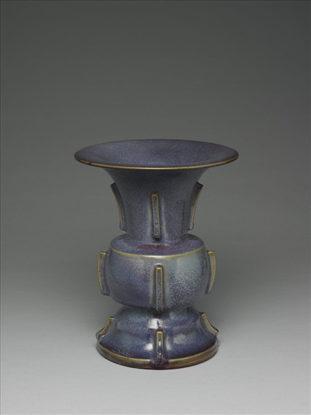 造型仿古銅器尊,口沿外敞,喇叭狀長頸接鼓腹,足脛外撇而下,矮圈足。器外頸、腹、足脛各裝飾突出的方稜四道。通體罩施丁香紫釉,紫色釉層間雜藍彩,釉面瑩亮,釉表氣泡稯眼十分明顯。施釉至足際,口沿及扉棱的土黃色邊,在深紫色釉的襯托下,份外鮮明。凹圓底施天藍色釉,釉面後刻有數目字「八」,刻痕內加填硃砂,足底緣塗褐色護胎釉。