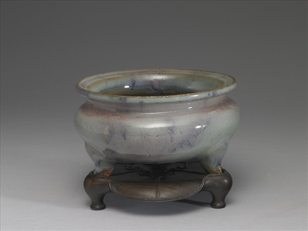 侈口、口沿一道折邊,短頸,扁圓腹,平底,三乳形足。通體罩施天青色釉,釉色泛灰,釉面帶紫色斑紋,局部間雜著深藍色條斑,圜底劃有一圈圓稜,與口沿皆呈褐黃色,三足底無釉處,加塗褐黃色護胎汁。