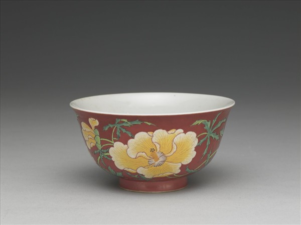 口外撇,深弧壁下斂,圈足。內外壁施透明釉,器外並以琺瑯彩繪飾紋樣。外壁以洋紅地花葉為裝飾主調,三大朵花等距盛開,分別為秋葵、月季、芙蓉。大花倆倆間又繪以半開花、含苞花,以及伸張有致的葉片。底外青料書「康熙御製」雙行四字楷款,外加方框。
