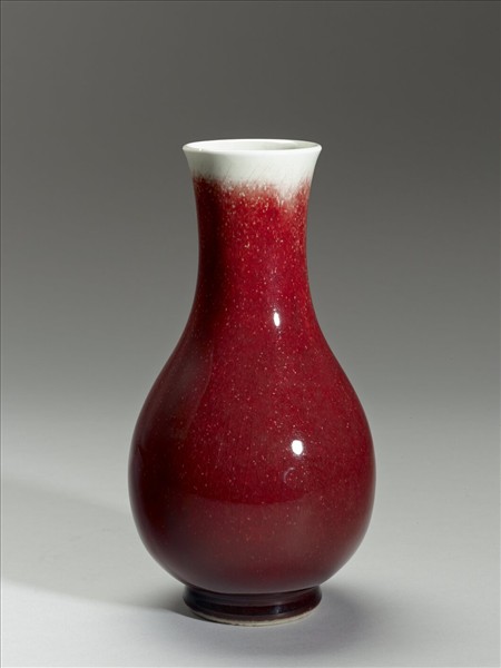 器仿銅器觶形,侈口,長頸,膽形腹,平底,矮圈足。器內白釉,外施紅釉,色澤光鮮亮麗,媲美寶石光彩,口下紅釉流失,留下不規則白邊,白釉略現淺綠,紅釉中密佈細小白點,釉色愈往底部色愈深,釉面紋片細密。圈足露胎,底白釉無款識。