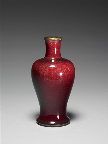 小圓口外撇,口緣鑲銅釦,直頸,豐肩下斂,近底處外撇,矮圈足。外壁施紅釉,釉色瑩亮而流動性高,所以肩頸以及近底處積釉處,顏色皆較深,其他如肩部等釉薄處,可見許多露出胎色的細小的點。圈足露胎一圈,底內施透明釉,無款識。