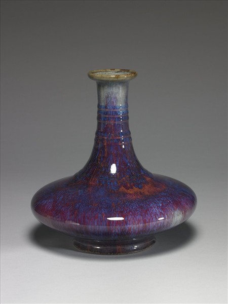 盤口,長直頸,扁盤狀腹,圈足。除器頸有數道凸棱外,全器無紋飾。器表施爐鈞釉,是呈紅、靛、紫、月白等多色深淺混雜流動窯變釉,為雍正時出現的新品種。口緣與頸部釉薄處,呈現出黃白等淡色,其他部份則是靛、紫等色交織出瑰麗的色彩。足緣露胎塗褐色汁,底外釉下刻「雍正年製」雙行四字篆款。