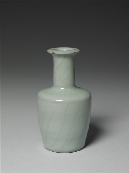 盤口,細長頸,斜肩轉折向下接碩腹。因尺寸較小,整體造型像是一只縮小版的紙槌瓶式。通體施青瓷釉,釉色粉青,口沿釉薄,現出灰色邊。頸腹開淺色大紋片。施釉至足際,足緣無釉,露出燒後胎色。底面鐫刻乾隆皇帝詠〈官窯小瓶〉:「宋時秘色四稱名,不及柴窯一片瑛。下視永宣茲又貴,由來品第鮮常衡」御製詩。詩末署「乾隆甲辰夏御題」紀年銘(乾隆四十九年,1784),並落「古香」一枚鈐印。傳世隨附有木座,面刻與器底相同的御製詩及紀年銘,惟落「太璞」一枚鈐印。乾隆皇帝鑑賞古陶瓷,最喜宋朝宮廷用瓷,故於「宋時秘色四稱名」之下,加注有「謂汝官哥定」,說明這四個窯口,正是他所認同的宋朝名窯。