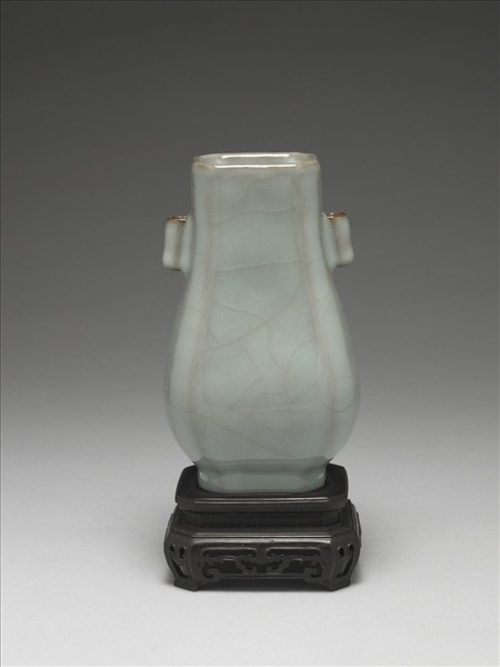 八方形,長頸,兩側面各飾一貫耳,碩腹,平底,矮圈足。通施粉青色釉,釉薄處現出褐色邊,施釉至足邊,底面有釉,足緣無釉加塗黑灰色護胎汁。 底面鐫刻乾隆皇帝〈詠官窯小瓶〉:「方橢青缾六寸許,孔穿雙耳繫繩長。擷芳攜取供吟興,絕勝奚奴背錦囊」御製詩。詩末無紀年銘,僅署「乾隆御題」,並落「古香」、「太璞」兩枚鈐印。傳世隨附木座,面刻與器相同的御製詩,詩末亦落「古香」、「太璞」兩枚鈐印。 臺北故宮與大英博物館的藏品中,皆見有器形與之相似,但底部卻寫有「大清乾隆年製」款識的作品,相比之下,可得出此亦為乾隆皇帝降旨御題當朝官窯的案例。