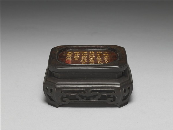 委角四方形木座,束腰,四足,足與足間有鏤空雕飾的邊欄。頂面弧角四邊形內凹,內填金隸字:「方橢青瓶六寸許,孔穿雙耳繫繩長。擷芳擕取供吟興,絕勝奚奴背錦囊。乾隆御題。」並填朱雕鈐「古香」、「太璞」二印。該詩為乾隆皇帝〈詠官窯小瓶〉,是乾隆四十七年(1782)之作,收於《御製詩四集》卷八十六。與院藏〈八方貫耳壺〉(故瓷17905)成組,為置放該件瓷器之木座。