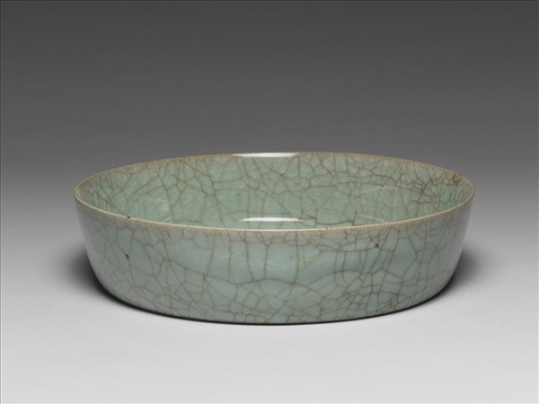 敞口圓洗,深直壁稍弧而下略斂,平底,口緣有傷。器內外滿施青釉,釉呈粉青色,後釉,多開片,釉層間滿布細碎冰裂紋。釉色瑩潤。外底支釘痕排列成內外兩圈,內圈支釘痕有八,外圈支釘痕有十二。