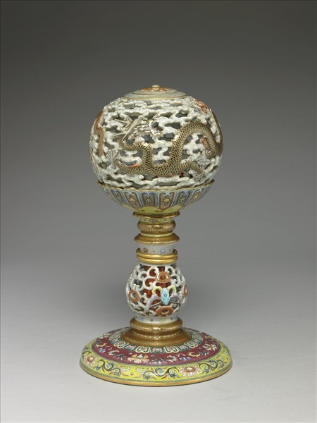 冠架由鏤空球形香薰、盤形承柱(含內承柱)、中段鏤空瓶腹、底座及雙活環等五部分組成。最上層的香薰呈鏤空圓球形,上雕飾雙龍戲球及雲紋,雙龍一紅一黑均描繪金彩,狀極華麗威嚴,香薰頂上帶一小蓋,蓋亦鏤雕成雙蝠捧壽紋,外繞描金回紋一圈。承柱形似高足盤,蓮瓣口,弧壁,上繪描金彩繪蓮瓣,下為三階形柱體與內承柱為一體,內承柱飾珊瑚地加金彩番蓮紋。中腹作鏤空瓶形,瓶頸套二金活環,瓶腹為鏤雕彩繪菊花蝴蝶紋。底部承座呈階梯式覆盤狀,盤座外沿為黃錦地洋菊花卉,內為紅錦地轉枝洋蓮及蓮瓣紋一圈。足底及邊線均施金彩。座底亦呈漸層階梯式圓狀全施湖綠釉,最內層底心留白方框內青花書「大清乾隆年製」六字三行篆款。