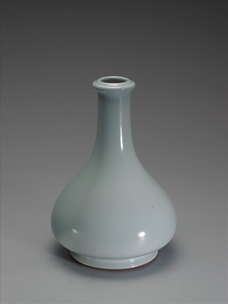 瓶,玉壺春式,小口作扁圓蒜頭式內折,長頸,腹下垂而寬碩,圈足。器外壁施青釉,色青灰偏藍調,為仿汝釉作品,安靜柔和。足緣露胎一圈塗褐色汁,足內滿釉,釉下青花書「大清雍正年製」三行六字篆款。