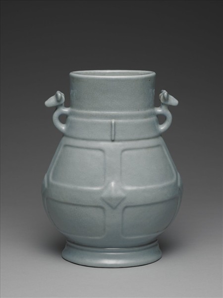 圓口,直頸,雙獸耳,碩腹,圈足外撇。頸部凸起環帶,與獸耳相連,有如帶獸耳的寬帶束於器頸。而器腹也用了同樣的裝飾設計,長形寬帶十字交錯於腹外壁,交錯處凸起四方形,有如固定兩交錯寬帶的金屬。全器施仿汝釉,釉色潤而青中帶灰,表面可見細碎冰裂紋。足緣露胎塗褐色汁,足內滿釉青花書「大清雍正年製」三行六字篆款。