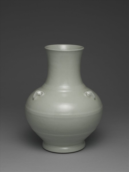 侈口,長直頸,豐肩,碩腹漸下斂,圈足。外壁施仿汝釉,釉色青灰。頸肩處與腹外壁皆見凸弦紋,肩部等距貼飾三羊首。足緣露胎塗褐色汁,足內滿釉青花書「大清雍正年製」三行六字篆款。