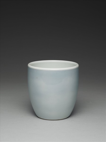 直口,深直壁,近底處下斂,平底內凹成足,口緣與器內壁施透明釉,呈色白。外壁光素無紋,施青釉,色淺藍而淡雅。足緣露胎一圈,足內滿釉青花書「雍正年製」雙行四字篆款。