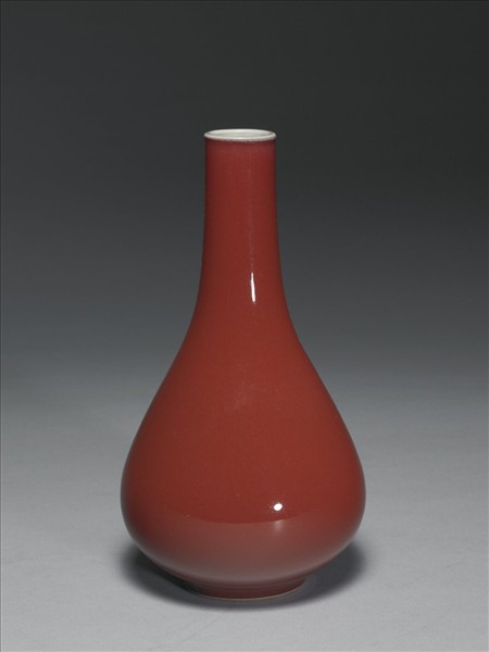 小圓口,長直頸,垂腹,圈足,器內施透明釉,器外施紅釉,釉色紅而勻亮,外壁光素無紋。足緣露胎一圈,足內施透明釉,釉下青花書「大清雍正年製」雙行六字楷款,外加雙圈。