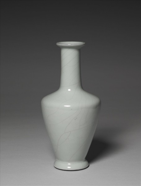 瓶,口似盤形,長頸,寬肩,斂腹,圈足外撇。胎骨薄,全器施青釉,仿宋代官釉,釉色濃潤,釉面佈有冰裂鱔血紋。足底露胎,塗有赭色護胎汁。底有青花書「大清乾隆年製」六字三行篆款。