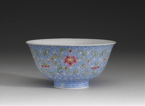 琺瑯彩藍地剔花纏枝花卉茶碗