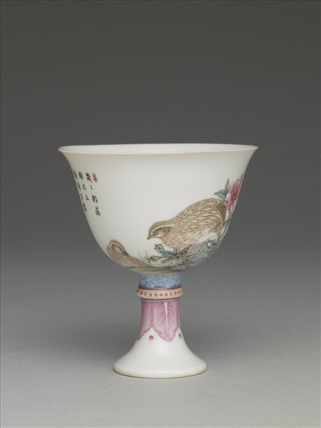 侈口,深壁,高足中空外撇。器內白釉無紋飾,外壁彩繪月季、鵪鶉及湖石花卉,象徵「四季平安」。足飾卷草、點紋及蕉葉紋。紋飾旁加飾題句︰「歲歲彩筵雕几上,歡聞百勝報雙鵪」,及「仁和」、「清」、「晏」三枚閒章,足內以藍料書「乾隆年製」四字楷款。