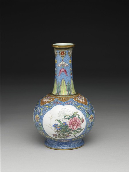 口唇邊,長頸,鼓腹,撇足。對瓶器面剔錐翠藍錦地,頸部彩繪六如意雲紋作灰黑地描金錦地紋、並垂掛珠花及吉慶有餘紋(磬及魚紋);頸肩處蕉葉紋、及描金凸棱一周;器肩三大三小如意紋內作紅地描金錦上添花番蓮紋;腹部作錦地番蓮花葉,三開光白釉上一繪芍藥,雛菊,石榴、蜀葵,芙蓉、野菊等花卉;另一則繪月季、李花,牡丹,茶花、野菊,菊花、雛菊、紅葉等折枝花卉。口肩足各描金三道,胎薄透光,潔白細膩,器底白地上藍料書「乾隆年製」四字二行楷款,外加雙方框。