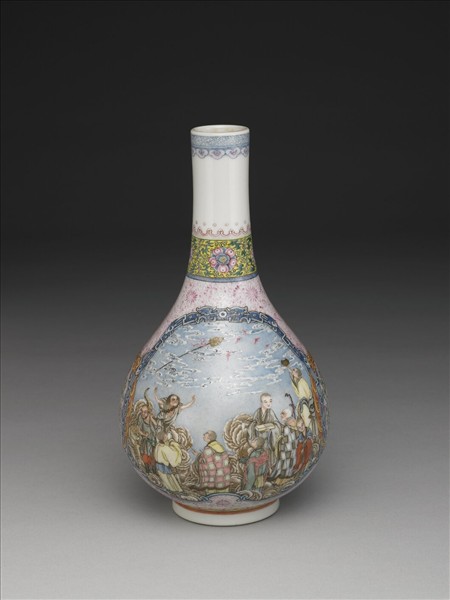膽瓶直口,長頸,碩圓腹,矮圈足。口沿及頸部各藍料畫萬字錦地紋、如意紋及彩繪黃地四團花卉紋一道。腹部兩面開光,各以交纏相向的深淺藍料夔龍紋為框邊,內各繪駕於雲間的九人、十八羅漢圖像,兩開光之間又串聯兩橘黃夔鳳圈飾,內繪盛開番蓮。隙地洋紅彩繪纏枝蓮紋,底邊畫淺綠如意雲紋一周。瓶底藍料書「乾隆年製」四字楷款,外加雙方框。