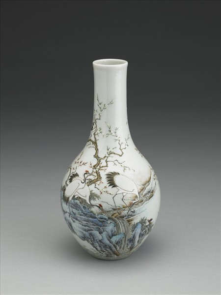 長頸,碩腹,淺圈足。通體白袖,腹部彩畫山石、流水、梅樹、靈芝與鶴鳥。底藍料書「乾隆年製」,四字篆款,外加雙方框。