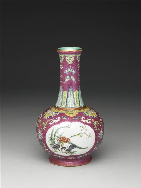 口唇邊,長頸,鼓腹,撇足。器外壁除三開光及器肩頸間的九如意圈外,通體錐剔洋紅錦地,隙地頸部六如意圈作錦地朵蓮、並垂掛珠花吉慶有餘紋(磬及魚紋);頸肩處蕉葉、及描金圖案紋一道;器肩三大三小如意紋內作黃地錦上添花紋,腹部三開光內各彩繪靈芝、水仙及竹葉,芝仙構圖各異。口足描金,器底及頸內施湖綠釉,底心留白框內藍料書「乾隆年製」四字二行篆款,外加雙方框。